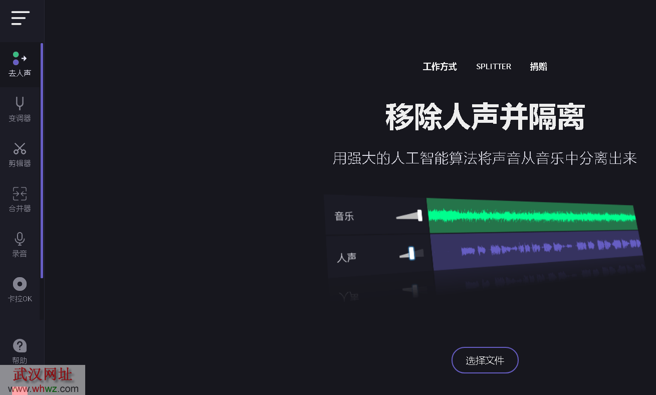 用強(qiáng)大的人工智能算法將歌曲中的聲音與音樂(lè)分開(kāi),多語(yǔ)言,可以選擇中文