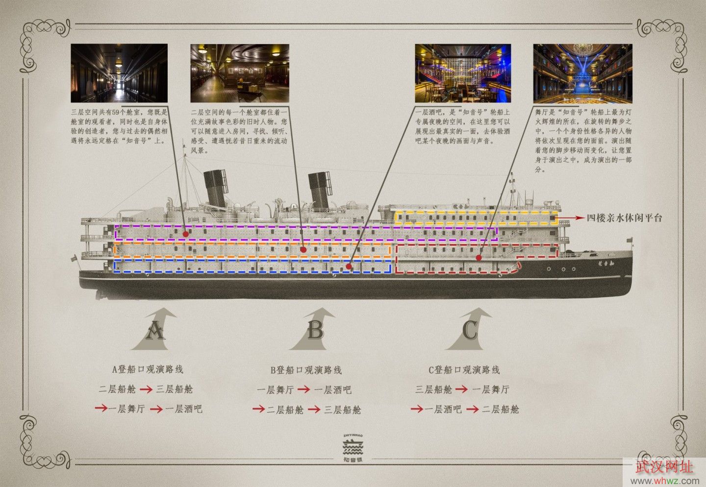 為使游客有更好的觀演體驗(yàn),《知音號(hào)》分為A、B、C三個(gè)登船口進(jìn)入“知音號(hào)”內(nèi),三條路線入口和路線不同但觀看內(nèi)容是相同的。