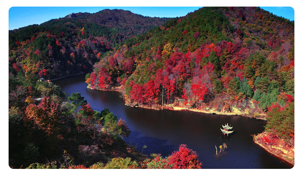 秋天的木蘭清涼寨層林盡染,丹“楓”朝陽,紅葉似火,景區(qū)萬畝森林中,三角楓、五角楓、七角楓、鳥桕樹和槭科類等多類秋季紅葉樹種達5000余畝, 與此同時,3萬多株古銀杏群和千畝圣潔茶花園披金戴銀,果實累累,紅楓與茶花媲美,金菊與銀杏爭芳,秋水共長天一色,形成“秋山秋水醉秋楓,如火如荼映蒼 穹;千紅萬紫凝,望眼。疑是香山入畫中”的的壯麗景觀。其面積之大,品種之多,淵源之悠長,葉色之鮮艷,為湖北乃至華中地區(qū)之最。每年11月上中旬到12 月中下旬,為最佳觀賞期。