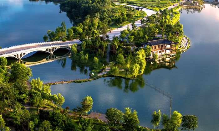 平湖歸雁景區(qū)緊鄰黃州大道,規(guī)劃面積30萬平方米。該景區(qū)視野通透,首先映入眼簾的是一灣平靜的湖水,不由得聯(lián)想起蘇東坡《西江月》中“點點樓頭細(xì)雨,重重江外平湖”的詞句。徜徉于湖邊樹下,忽見開闊的湖面上空飛來一群雁陣,感受大雁歸來的喜悅,實為人生樂事。蘇東坡《調(diào)笑令》中“歸雁,歸雁。飲啄江南南岸”的詞句,也與此情此景交融相映。該景區(qū)是市民戶外運動休閑的功能區(qū)。